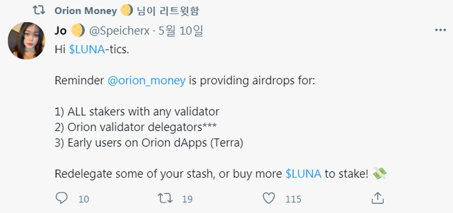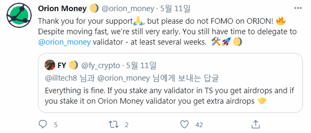 모든 스테이커에게 에어드랍이 갈 거라고 하고요.그중에 오리온 머니(orion.money) 밸리데이터에게