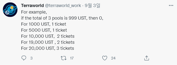 이런 식인 것 같습니다.티켓이 많으면 많을 수록 당첨 확률은 올라가겠지만, 저는 저런 정도로 UST가 없어서 티켓 1장에 만족하려고요. ㅎㅎ