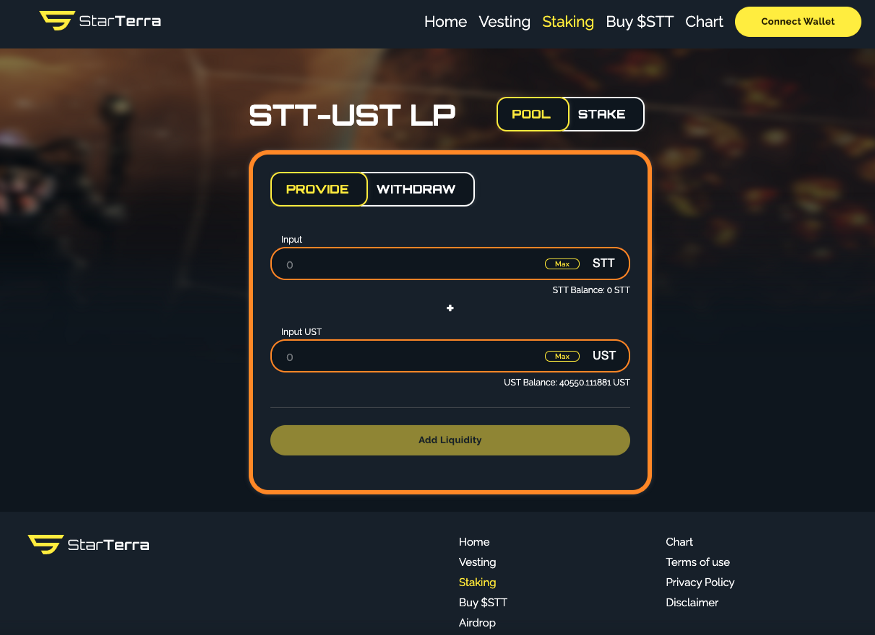 스타테라 플랫폼(https://starterra.io/)에서 IDO를 진행하는 신규 토큰을 에어드랍 받기 위해서는 STT 토큰을 스테이킹해야 합니다.현재는 단일 스테이킹은 할 수 없고 STT와 UST를 묶어서 LP를 스테이킹하는 수밖에 없는데요.