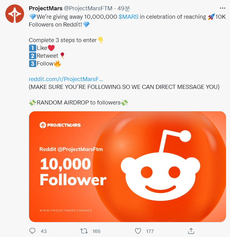 https://twitter.com/ProjectMarsFTM/status/1437223523886374915이건 간단합니다. 트위터 팔로우, 라이크, 리트윗만 하면 끝입니다.