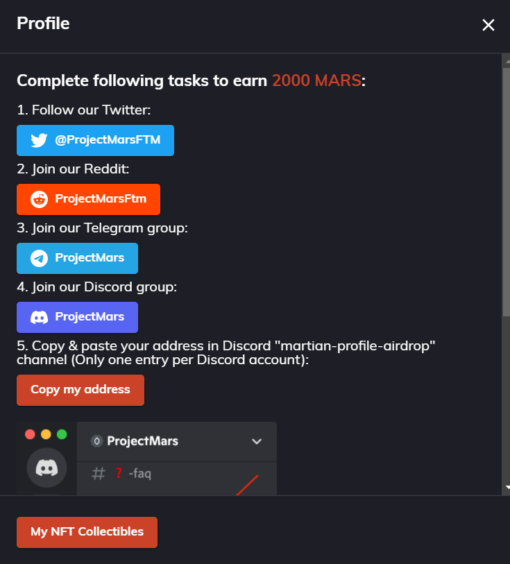 트위터, 레딧, 텔레그램, 디스코드 팔로우까지 마치면 2000 마스(MARS) 토큰을 받을 수 있습니다.