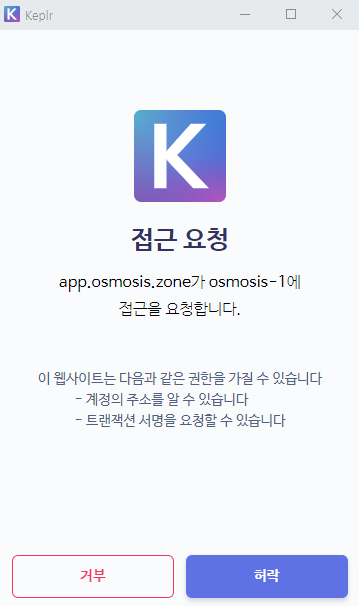 한 번 더 케플러 지갑 접근 요청 창이 뜹니다. 이건 어떤 덱스를 쓰던 필요한 과정이기에 허락을 눌러주면 됩니다.