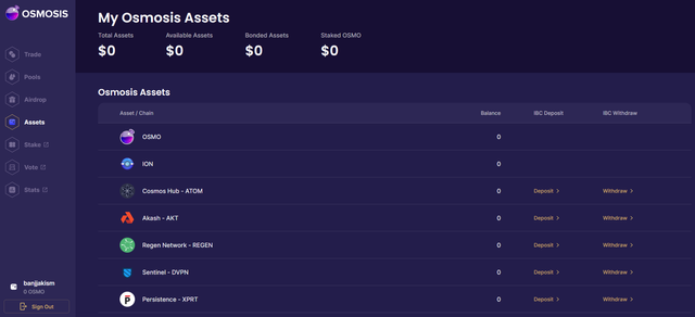 ‘Assets’으로 들어가면 아무것도 없다고 나오는데요. 케플러 지갑에 있는 아톰을 다시 오스모시스로 입금하는 과정이 필요합니다.