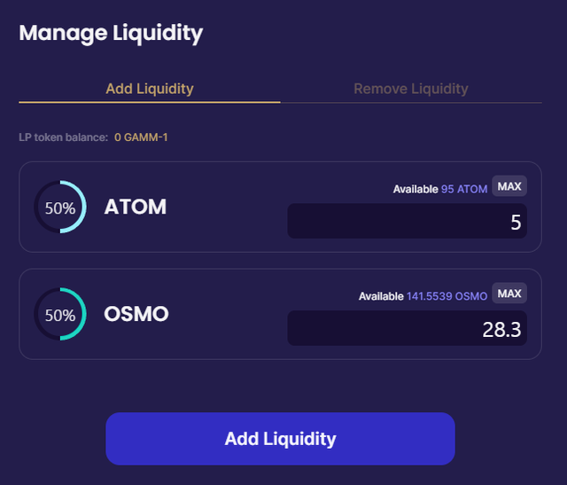 아톰 5개와 오스모 28.3개를 풀로 묶겠습니다. ‘Add Liquidity’ 클릭!