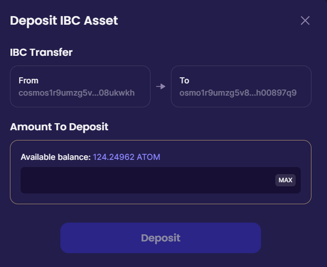 원하는 수량을 입력하고 ‘Deposit’을 누릅니다. 소량의 아톰 수수료가 필요하기에 일부는 케플러 지갑에 남겨두시길 추천합니다.