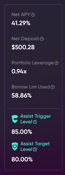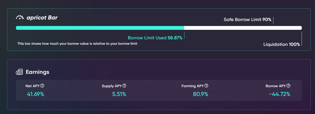 *전체 자산 대비 사용한 대출 비중(Borrow Lim Used) : 58.85%연 이율 41%면 디파이 세계에서는 그렇게까지 높은 건 아닙니다만, 대출한 자산까지 포함해서 제 자산이 입금액 대비 약 2배가 된 상황이기 때문에 단순 계산으로는 이율도 X 2를 해야 하는 것 아닐까 싶습니다.