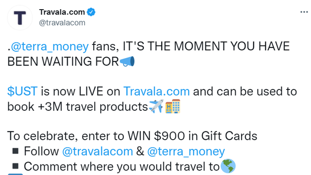 트라발라 공식 트위터가 UST 사용이 시작됐다는 것을 알리며 이벤트도 하나 열었습니다.