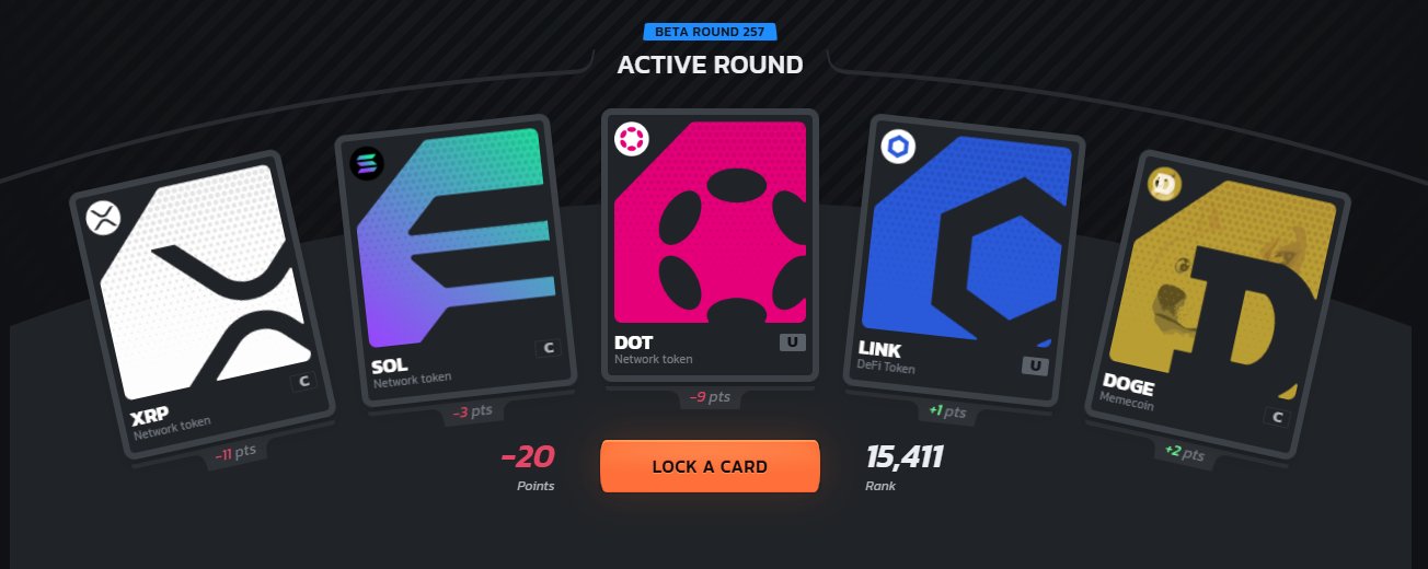 매일 코인 카드 5장을 고르고, 해당 코인의 가격 변동에 따라 점수를 얻어 랭킹을 겨룹니다.
