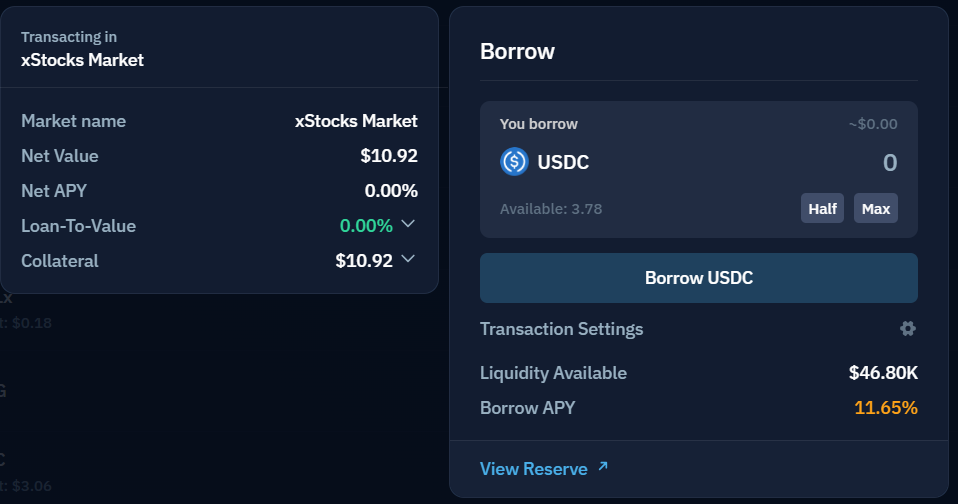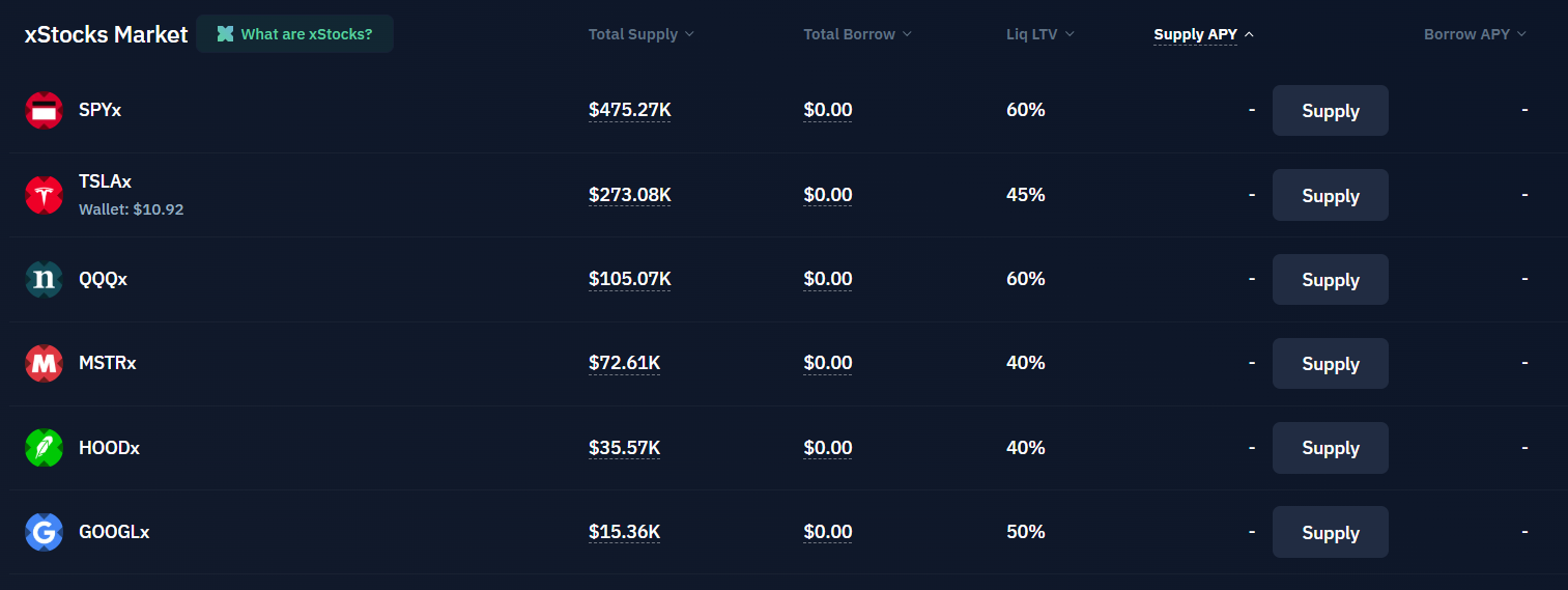 - 예치는 가능, 주식 토큰 대출은 불가: 현재는 TSLAx, AAPLx 같은 주식 토큰을 예치(Supply)할 수는 있지만, 다른 사람이 이 주식 토큰을 빌려갈(Borrow) 수는 없습니다.