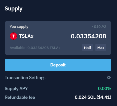 - 'Supply' 버튼을 눌러 보유한 TSLAx를 예치합니다.