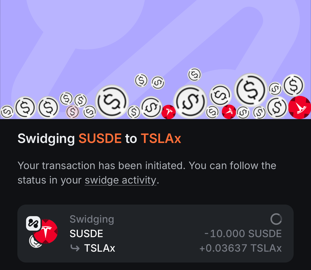 이번 실습에서는 테슬라(TSLAx) 토큰을 활용해 보겠습니다. 이전 글에서와 마찬가지로 인피넥스의 Swidge 기능을 사용하면 USDC나 SOL 등으로 손쉽게 TSLAx를 매수할 수 있습니다.
